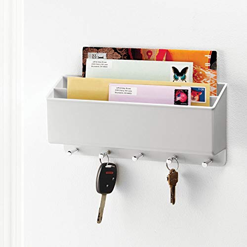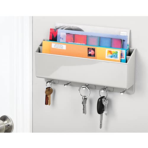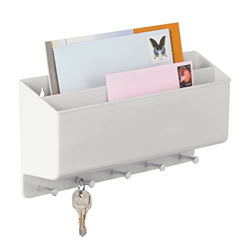 mDesign praktische Briefablage für Flur und Küche – kompaktes Schlüsselboard mit 2 Fächern für Post und 5 Haken – wandmontiertes Schlüsselbrett aus Kunststoff und Metall – hellgrau