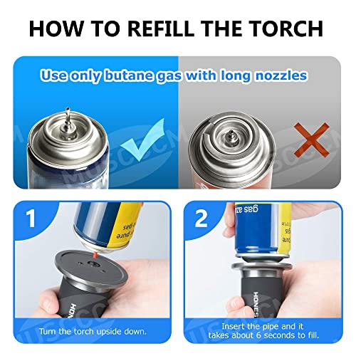 Eenvoudig te bedienen: Om de keukenbrander flambeerbrander met butaan te vullen. Schuif gewoon de veiligheidsslot van de vlambrander om hem te openen, druk dan op de knop en de vlam ontsteekt zichzelf. Eenvoudige en nauwkeurige bediening.